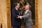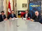 El consejero José Carlos Gómez Villamandos firma con el director Ángel Ibarra el convenio que materializa la subvención destinada a financiar la cimentación y la edificación de las estructuras primarias.